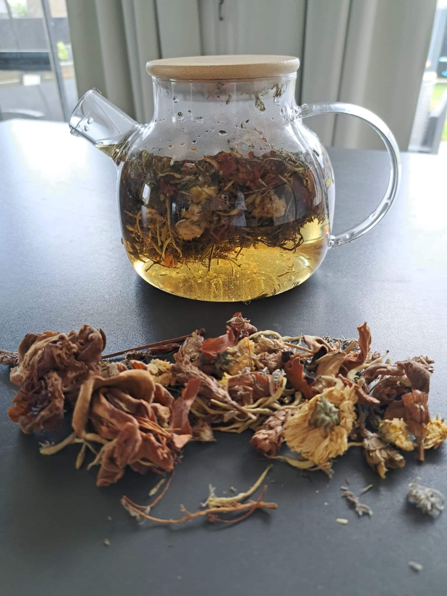 Kapokbloesem (Celba petandra) 35% / Heelblaadjes alsem (Artemisia Scoparia) 25% / Kamperfoelie (Lonicera japonica) 16% / Chrysant (Chrysanthemum paludosum) 10% / Brunel (Prunella vulgaris – Bijenkorfje) 10%